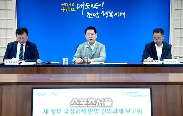 [스포츠서울┃조광태기자] 전라남도는 10일 이재명 정부 출범에 발맞춰 ‘새 정부 국정과제 반영 건의과제 발굴 및 보고회’를 열어 솔라시도 AI에너지 신도시 등 도정 핵심현안과 제도개선 등 건의과제 반영을 위한 대응방향을 논의했다.