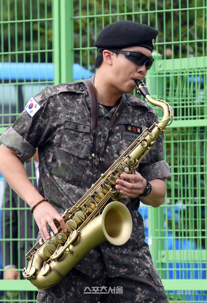 맏형 진의 전역일에도 색소폰으로 축하 공연을 했던 RM은 이번엔 자신의 전역을 자축하는 연주로 뷔와 함께 취재진과 팬들 앞에 섰다.