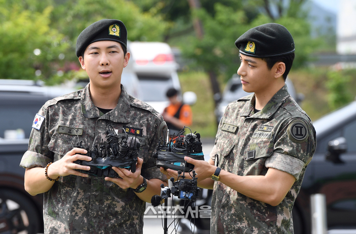 RM과 뷔는 10일 강원도 춘천시 신북읍 체육공원에서 진행된 전역 행사에서 취재진과 팬들 앞에서 소감과 인사말을 남기는 시간을 가졌다.