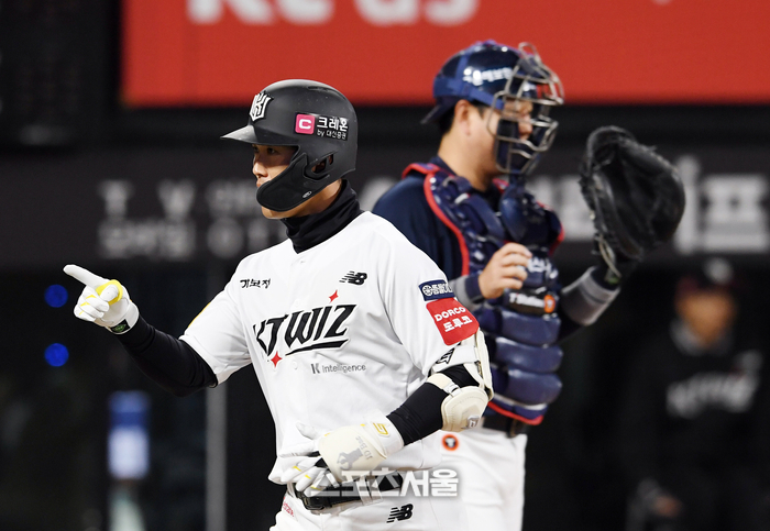 KT는 1회말 첫 공격부터 기선을 제압했다. 1사 3루에서 안현민이 유격수 방면 내야 안타를 쳤다. 그 사이 3루 주자 배정대가 홈을 밟으며 선취점을 냈다.