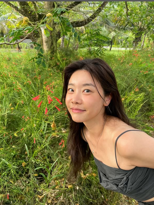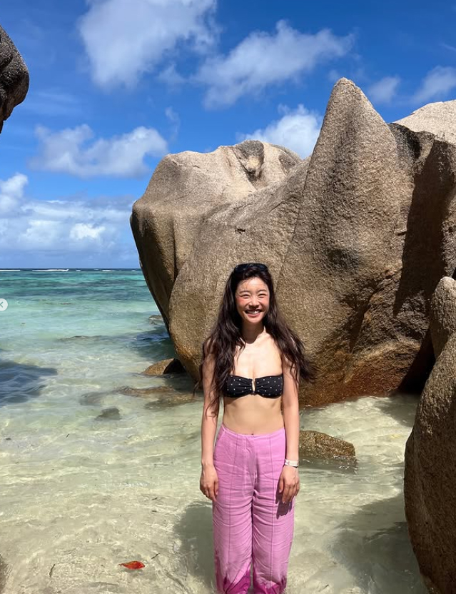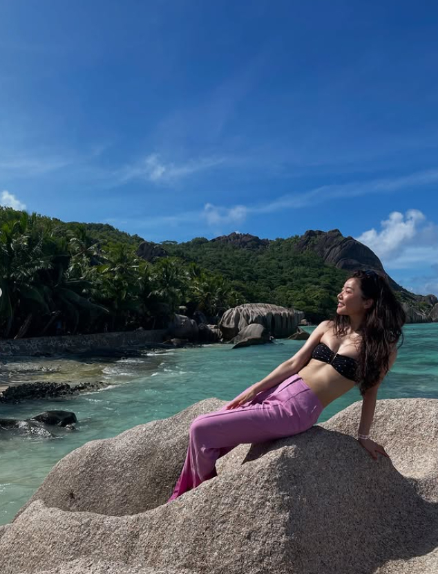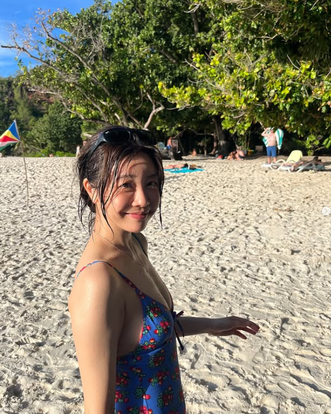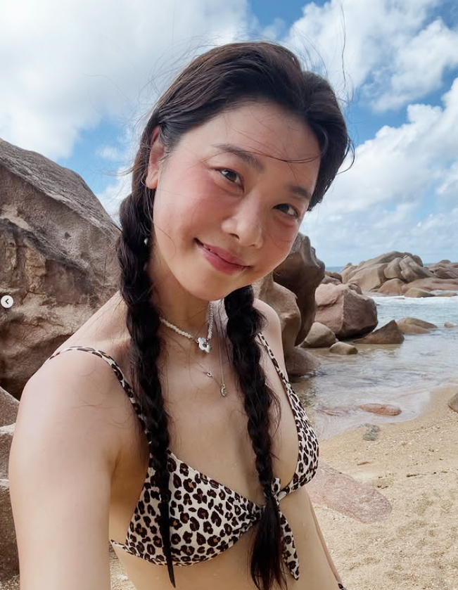 다른 사진에서는 보라색 와이드 팬츠와 비키니 상의를 매치하여 편안하면서도 스타일리시한 비치룩을 선보이며, 바위에 앉아 푸른 바다를 배경으로 포즈를 취하거나 맑은 물에 발을 담그고 미소 짓고 있다. 특히 얼굴을 클로즈업한 사진에서는 젖은 머리와 선글라스를 이마에 걸친 채 카메라를 향해 환하게 웃고 있어 자연스러운 아름다움을 더욱 부각한다.