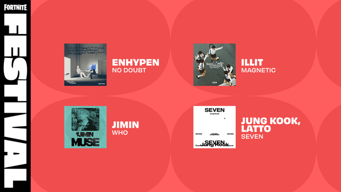 끝이 아니다. BTS 정국과 지민, 엔하이픈, 아일릿 등 국내 인기 아티스트들의 음악이 포트나이트 리듬 게임 콘텐츠 ‘잼트랙’에 추가됐다. 이용자는 해당 곡들을 직접 연주하거나 리믹스하며 다른 유저와 함께 즐길 수 있다.