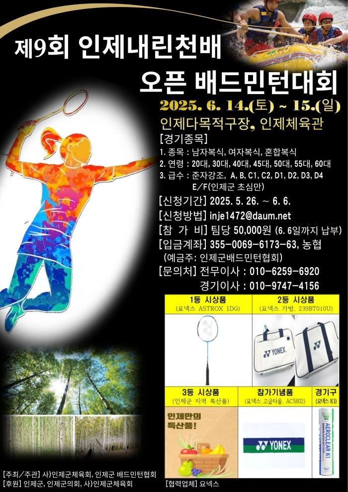 먼저, ‘제9회 인제 내린천배 오픈 배드민턴 대회’가 6월 14일부터 15일까지 인제다목적체육관, 인제남초등학교 체육관에서 개최된다.