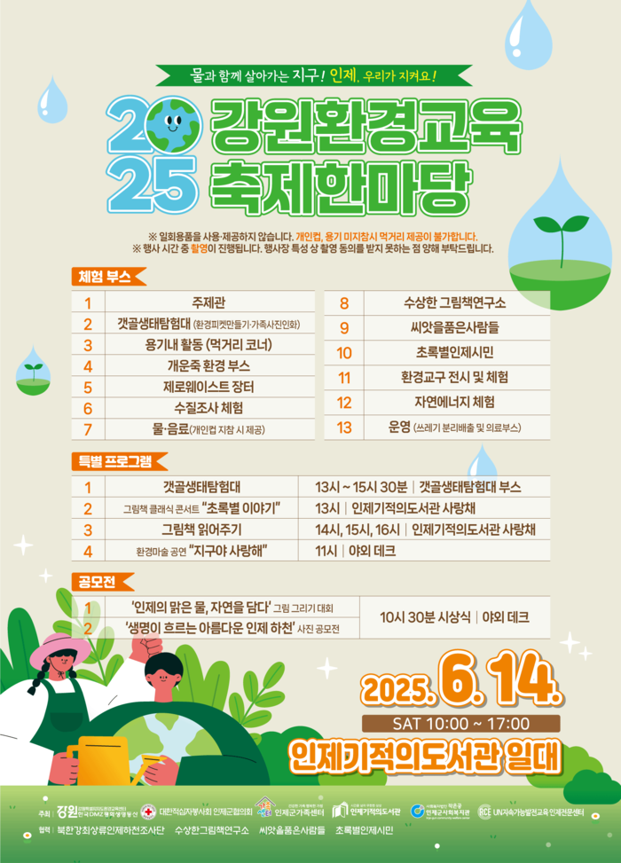 6월 14일 인제 기적의도서관 일원서 개최…“물과 함께 살아가는 지구! 인제, 우리가 지켜요!”