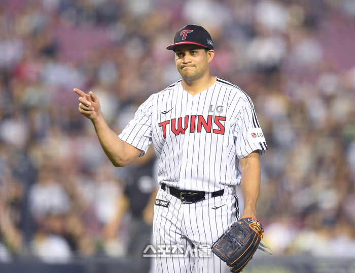 LG 선발투수 치리노스가 12일 서울 잠실구장에서 열린 2025 KBO리그 SSG와 경기 4회초 2사1,2루 상대 에레디아를 내야땅볼로 처리한 후 덕아웃으로 들어오고 있다.