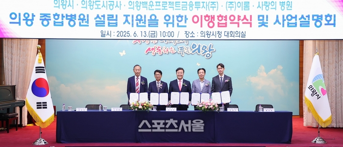 이번 협약은 학의동 918-5번지 일원에 설립되는 의왕 종합병원 설립 및 운영을 위해 기관 상호 간 권리와 의무를 정하는 사항으로 ▲의왕시는 종합병원 건립을 위한 행정 지원 ▲의왕도시공사는 의왕백운PFV 청산 이후 공공기여 관리 ▲사랑의 병원은 종합병원 건립과 운영 ▲㈜이롬은 종합병원 건립에 관한 내용을 각각 협약에 담겼다.