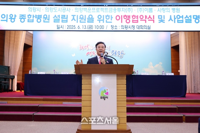 〔스포츠서울│의왕=좌승훈기자〕김성제 의왕시장은 13일 시청 대회의실에서 열린 종합병원 설립을 위한 이행협약식 및 사업설명회에서 “최초의 응급의료센터를 갖춘 종합병원이 유치되기까지 물심양면으로 도와주신 관계자분들에게 감사드린다”며 “시민들의 오랜 숙원사업인 의왕 종합병원 설립이 체계적으로 추진될 수 있도록 최선을 다하겠다”고 말했다.