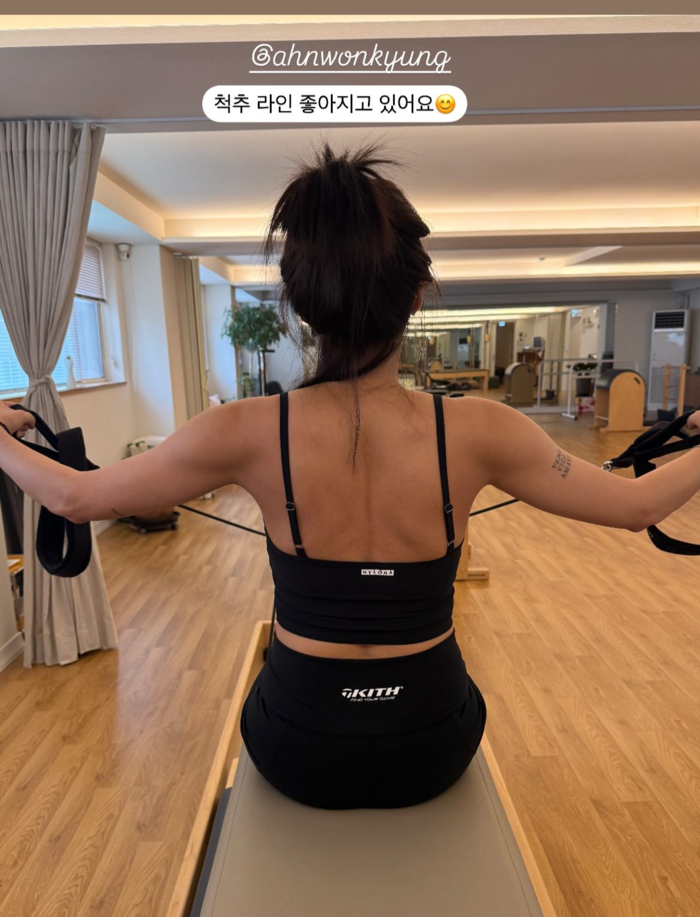 사진 속 손담비는 운동복의 편안한 차림으로 거울 셀카를 찍고 있다. 이어 척추 라인이 좋아지고 있다며 근육이 돋보이는 등 사진을 공개했다.