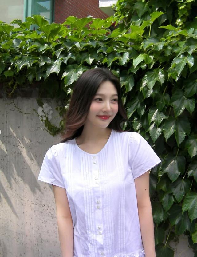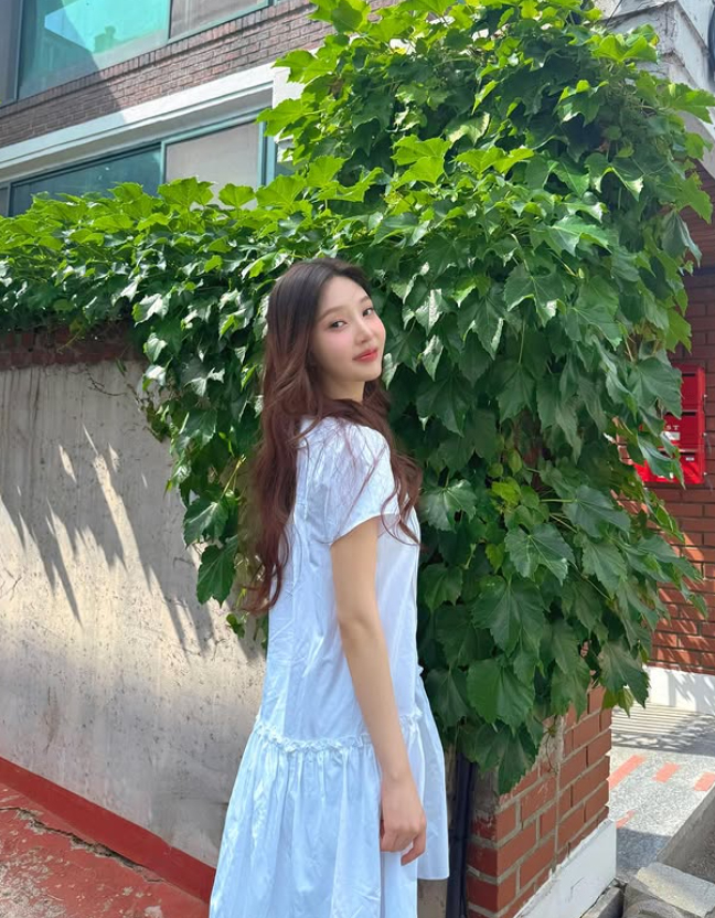 시원해 보이는 화이트 원피스는 조이의 청순한 매력을 더욱 돋보이게 한다. 특히 섬세한 핀턱 주름과 레이스 장식이 더해진 상의 디자인은 사랑스러운 분위기를 자아낸다.