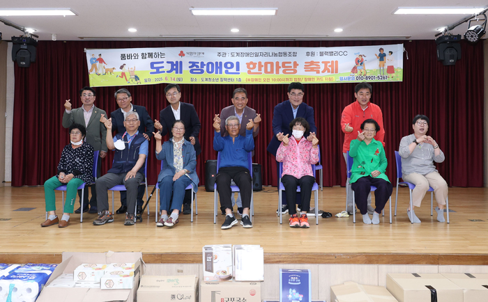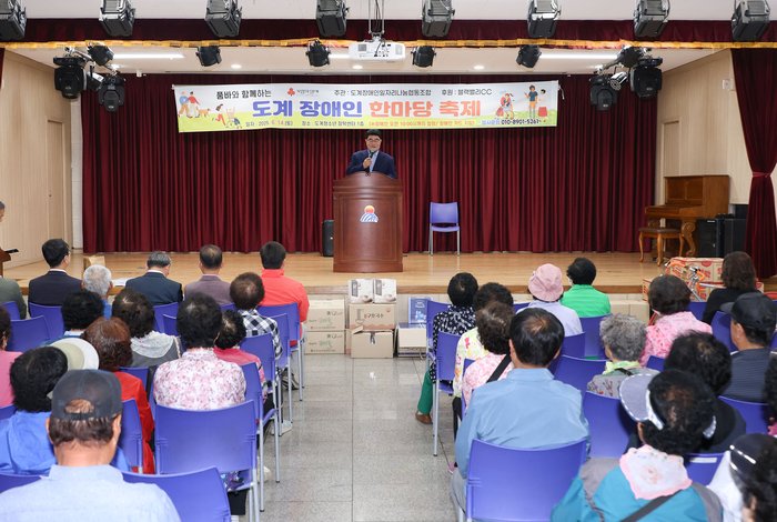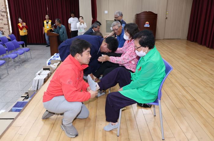 [스포츠서울ㅣ김기원기자]삼척시 도계 장애인 한마당 축제 행사가 14일 도계청소년장학센터에서 도계장애인일자리나눔협동조합 주관으로 열려 내빈들이 어르신들에게 새 양말을 신겨 드리는 이벤트와 함께 품바공연 등이 펼쳐졌다.