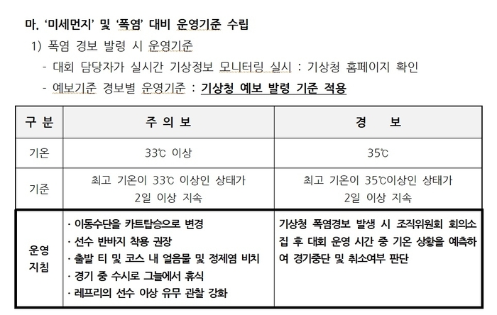 참고로 KGA는 폭염에 따른 경기운영 기준을 별도로 갖고 있다. 최고 기온이 섭씨 33도 이상 이틀간 지속되면 ‘주의보’ 35도 이상 기온이 이틀간 유지되면 ‘경보’로 각각 분류한다. ‘주의보’ 때는 카트로 이동하고 얼음물과 정제염(소금) 등을 티잉 그라운드와 코스 곳곳에 배치한다. ‘경보’는 기상상황을 들여다본 뒤 경기 중단이나 취소할 수 있도록 운영지침을 세웠다.