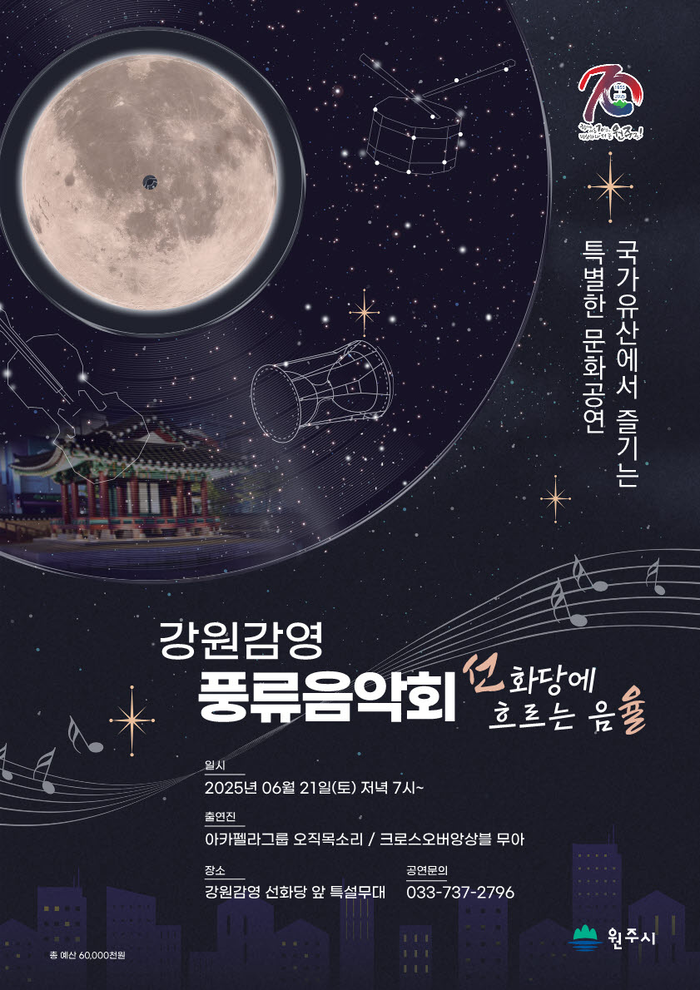 이번 음악회에서는 ‘선율: 선화당에서 흐르는 음율’을 주제로, 국가유산 보물 선화당을 무대로 음악 공연이 펼쳐진다. 선화당을 감싸는 선율과 함께 강원감영의 멋과 풍취를 눈과 귀로 즐길 수 있다.