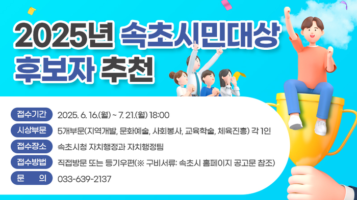 [스포츠서울ㅣ김기원기자]속초시는 다음 달 21일까지 2025년 속초시민대상 수상자 선정을 위한 후보자 추천을 받는다.