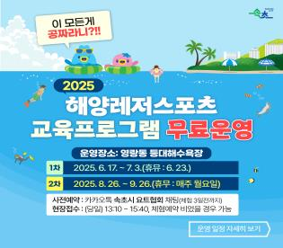 [스포츠서울ㅣ김기원기자]속초시와 속초시요트협회(회장 김성철)는 6월 17일부터 9월 26일까지 영랑동 등대 해변에서 해양레포츠 교육프로그램 무료 운영을 진행한다.