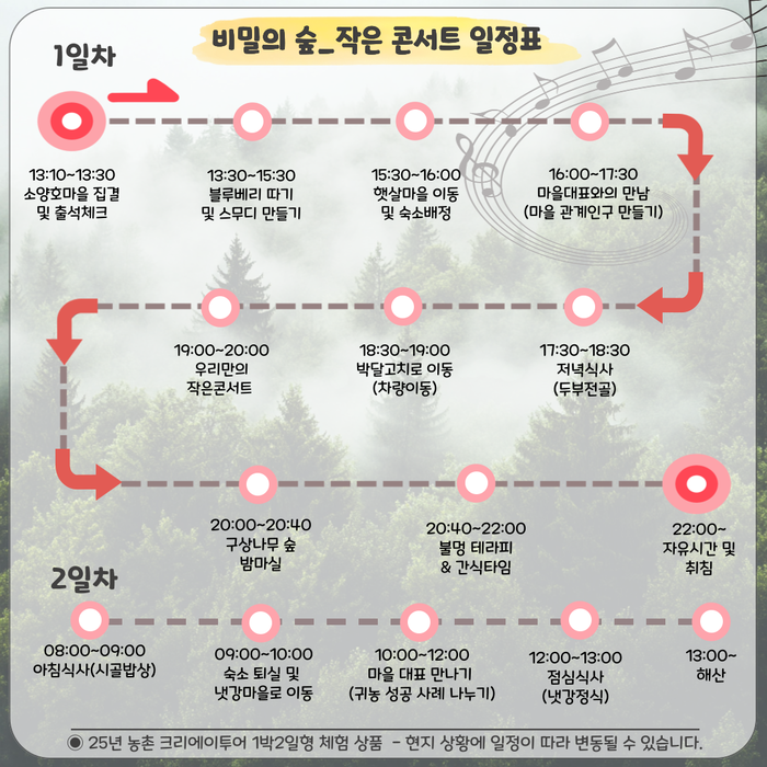 한편, 인제로컬투어사업단의 ‘비밀의 숲<우리만의 작은 콘서트>’ 프로그램은 인제군 농촌 크리에이투어 지원사업의 일환으로, 군은 농림축산식품부 공모 사업에 선정되며 확보한 총사업비 2억 5,000만 원을 투입해 농촌 관광프로그램 발굴 및 운영을 지원하고 있다.