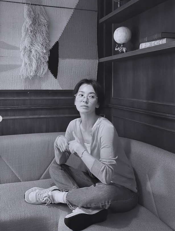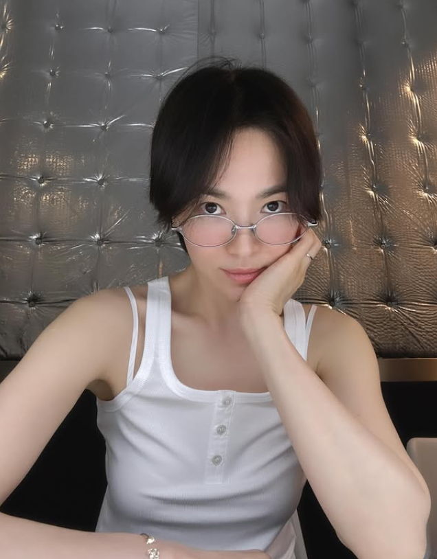 공개된 사진 속 송혜교는 화장기 없는 수수한 모습에도 불구하고 독보적인 아우라를 뽐냈다. 흰색 민소매 티셔츠에 안경을 쓴 자연스러운 차림은 마치 화보의 한 장면을 연상시키며, 43세라는 나이가 믿기지 않는 비주얼을 자랑했다.