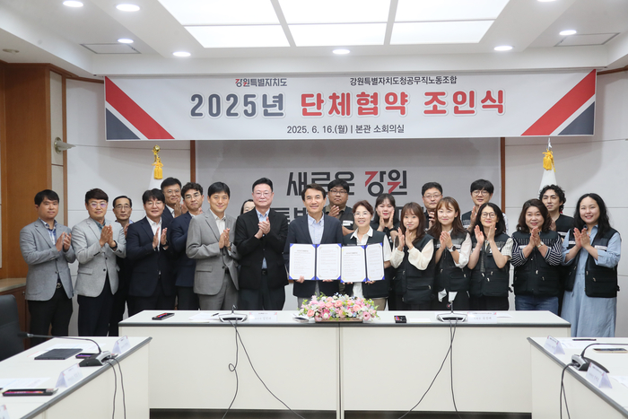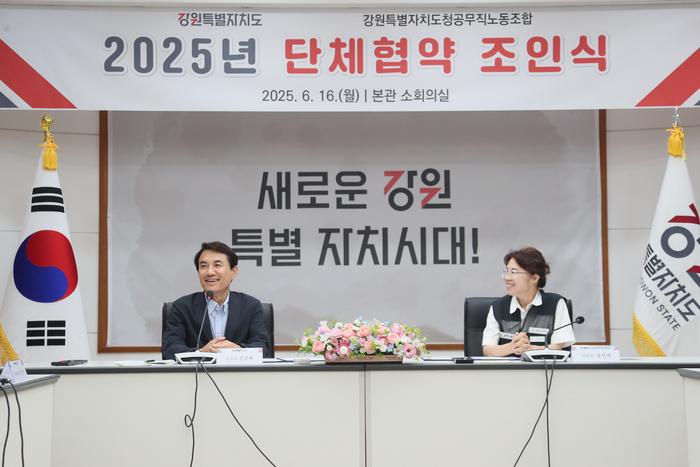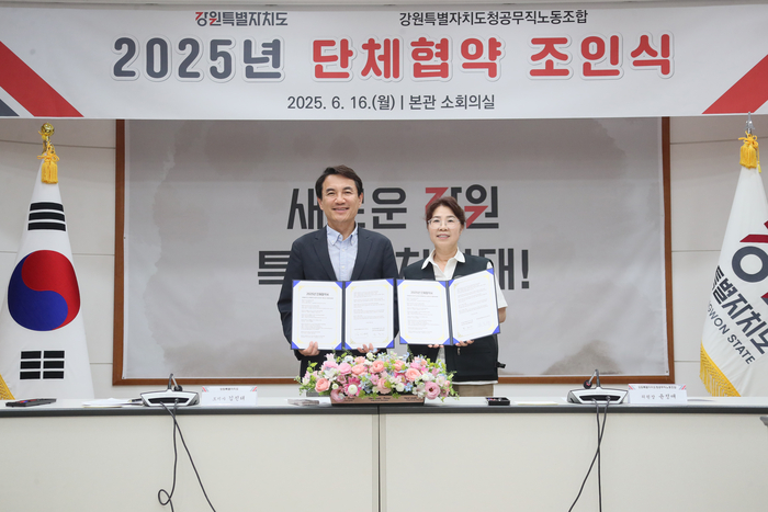 [스포츠서울ㅣ춘천=김기원기자]강원특별자치도(도지사 김진태)와 강원특별자치도청공무직노동조합(이하 ‘교섭대표노동조합’)은 6월 16일(월) 도청 회의실에서 2025년 단체협약 조인식을 개최하고 협약을 체결했다.