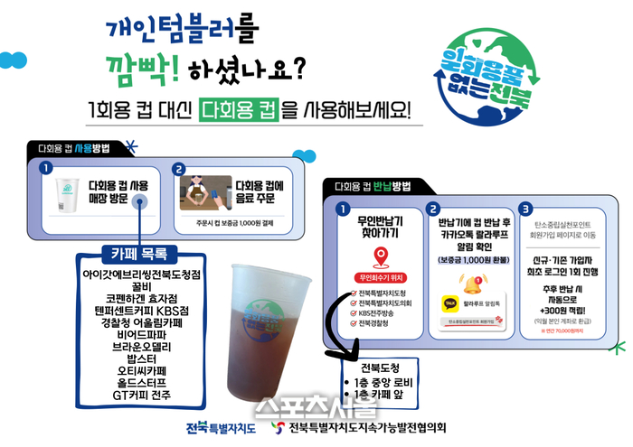 [스포츠서울 l 전주=고봉석 기자] 전북자치도는 지난 13일 김관영 도지사와 도내 카페 64개소의 소상공인 대표들이 함께 ’일회용품 없는 전북 만들기’ 자발적 협약을 체결했다고16일 밝혔다.