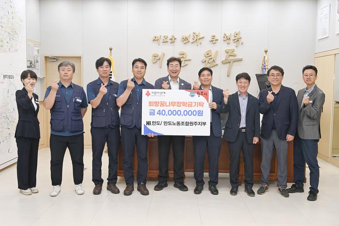 [스포츠서울ㅣ원주=김기원기자]HL만도 원주공장(센터장 김흥선)과 만도노동조합 원주지부(지부장 김택수)는 지난 16일 원주시장 집무실을 방문해 ‘제12회 희망꿈나무 장학금’ 4천만 원을 전달했다.