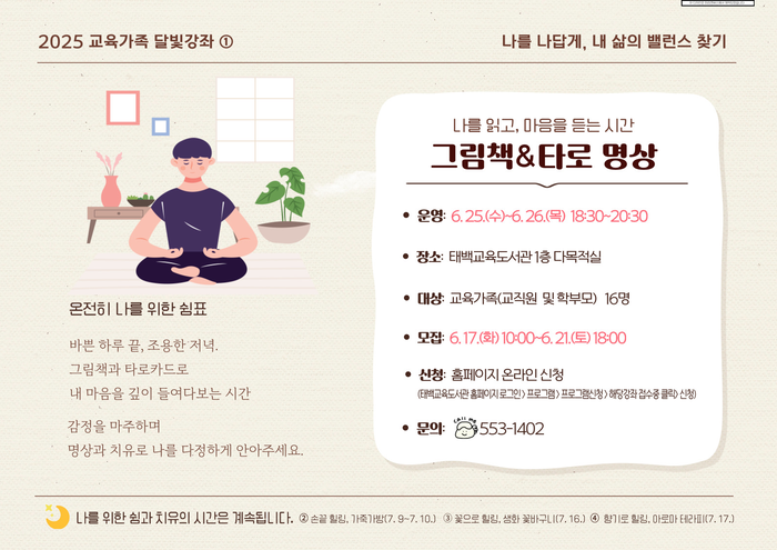 첫 강좌는 ‘나를 읽고, 마음을 듣는 시간’을 주제로 한 ‘그림책&타로 명상’이다. 6월 25일(수)과 26일(목) 이틀간 오후 6시 30분부터 8시 30분까지 운영되며, 그림책과 타로카드를 통해 내면의 감정을 돌아보는 시간이 마련된다.