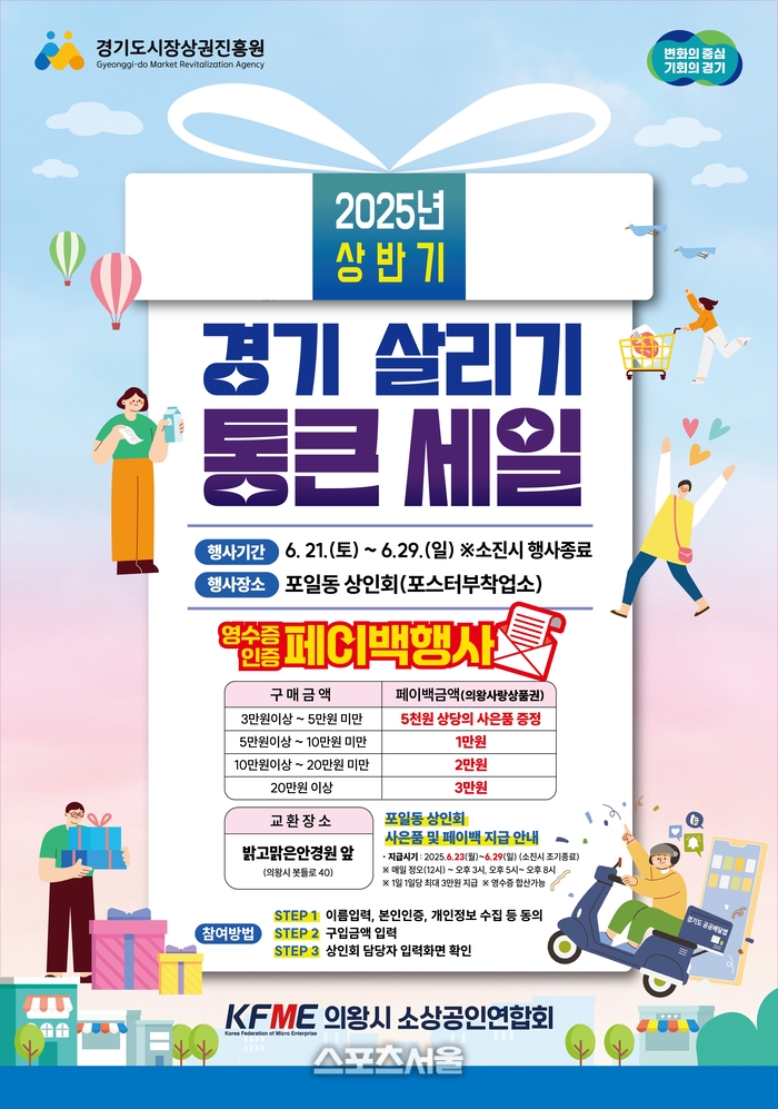 페이백은 의왕사랑상품권 또는 온누리상품권으로 지급되며, 동일 상권 내 영수증 합산이 가능하다. 행사 첫 날인 21일에는 이번 프로젝트의 시작을 축하하는 ‘통큰 세일 축제(페스타)’가 갈미문학공원에서 열린다.