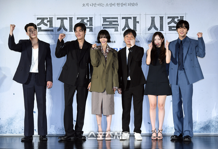 17일 서울 광진구 롯데시네마 건대입구점에서 진행된 영화 ‘전지적 독자 시점’ 제작발표회에서 출연 배우들이 취재진을 향해 포즈를 취하고 있다. 왼쪽부터 신승호, 이민호, 나나, 김병우 감독, 채수빈, 안효섭.