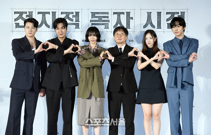17일 서울 광진구 롯데시네마 건대입구점에서 진행된 영화 ‘전지적 독자 시점’ 제작발표회에서 출연 배우들이 취재진을 향해 포즈를 취하고 있다. 왼쪽부터 신승호, 이민호, 나나, 김병우 감독, 채수빈, 안효섭.