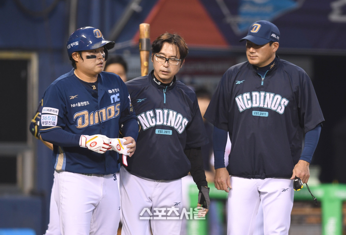 NC 권희동이 17일 서울 잠실구장에서 열린 2025 KBO리그 LG와 경기 5회초 무사만루 상대 장현식의 투구에 맞은 후 고통스러워하고 있다.