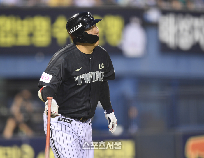 LG 김현수가 17일 서울 잠실구장에서 열린 2025 KBO리그 NC와 경기 5회말 1사1루 우월홈런을 날린 후 타구를 바라보고 있다.