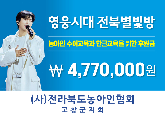 [스포츠서울 | 배우근 기자] 가수 임영웅 팬클럽 전북별빛방은 지난16일 임영웅 생일을 맞아 농아인을 위해 477만원을 후원했다. 더불어 사는 사회를 만드는 데 동참한 것.