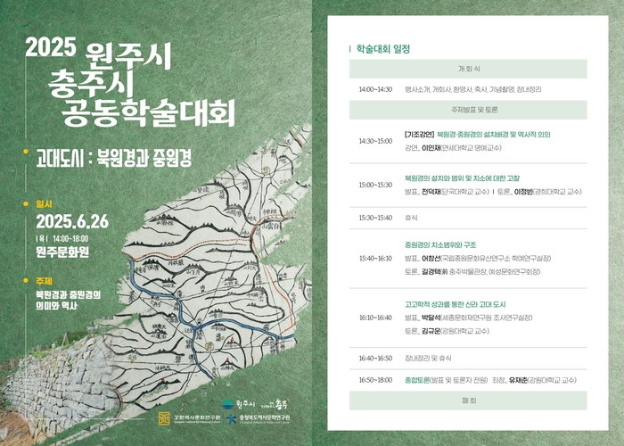 [스포츠서울ㅣ원주=김기원기자]원주시(시장 원강수)와 충주시(시장 조길형)가 공동으로 주최하고, 강원역사문화연구원(원장 최종모)과 충청북도역사문화연구원(원장 김양희)이 공동으로 주관하는 ‘고대도시: 북원경과 중원경’ 학술대회가 6월 26일(목) 오후 2시부터 원주문화원에서 개최된다.