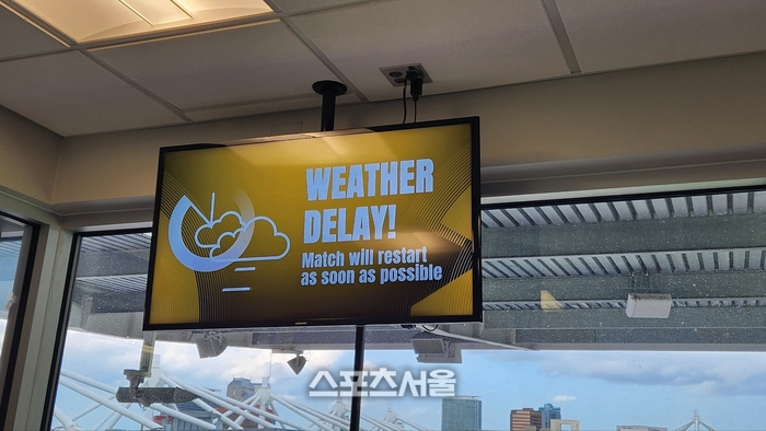 그런데 킥오프 직전 장내 전광판에 ‘웨더 딜레이(Weather Delay)’라는 문구가 등장했다. 갑작스럽게 비구름이 몰렸는데 낙뢰 위험이 있어 킥오프를 지연했다. 장내 아나운서는 양 팀 선수 뿐 아니라 관중도 실내로 들어가라고 안내했다.