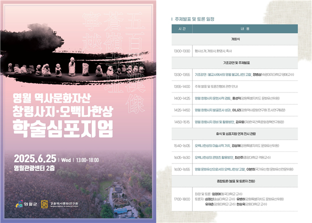 [스포츠서울ㅣ춘천=김기원기자]강원역사문화연구원(원장 최종모)과 영월군(군수 최명서)은 오는 6월 25일(수) 오후 1시부터 영월관광센터 2층에서 영월 창령사지와 오백나한상의 역사적 가치를 재조명하기 위한 「영월 역사문화자산 창령사지·오백나한상 학술심포지엄」을 개최한다고 밝혔다.