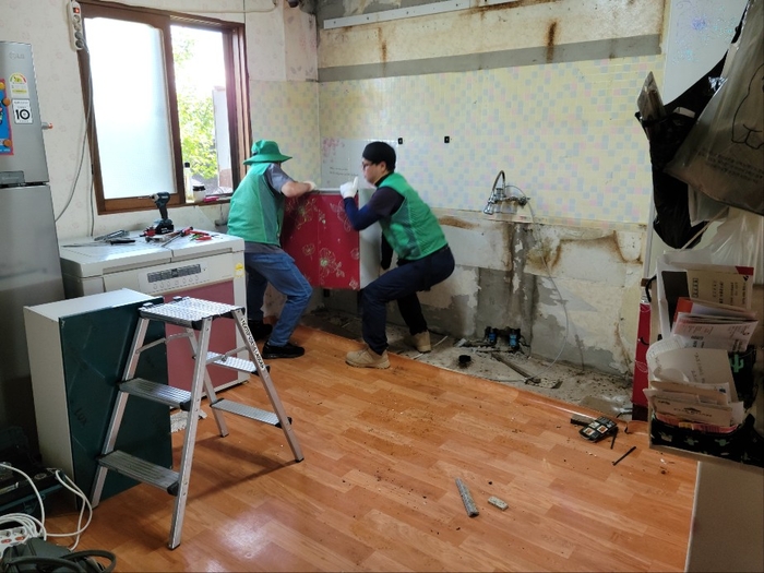새마을지도자 박형길 회장 외 8명이 함께 하며 싱크대와 장판 등 주거에 불편했던 곳곳을 교체했다.