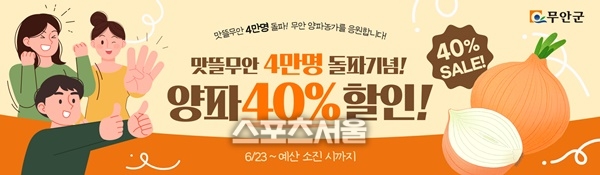 [스포츠서울| 조광태기자] 전남 무안군 농특산물 ‘맛뜰무안몰’은 회원 수 4만 명 돌파를 기념해 오는 23일부터 무안 양파 40% 특별 할인전을 진행한다.