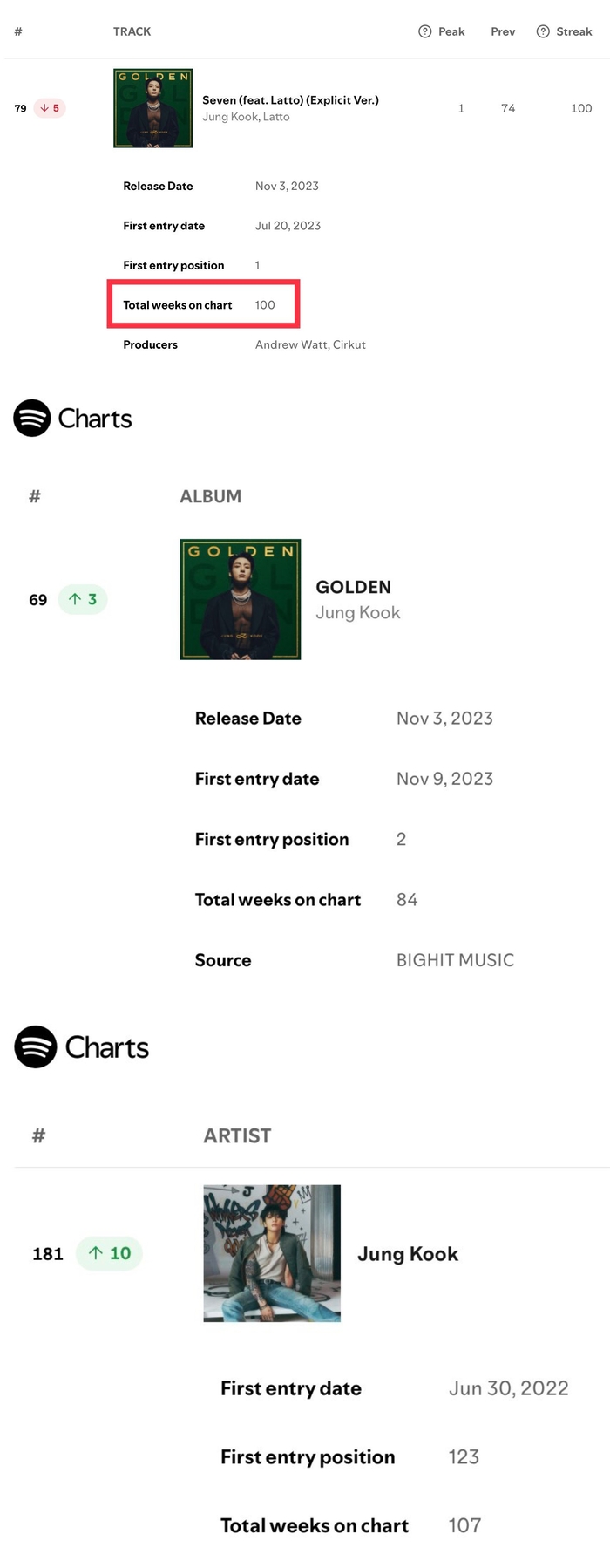 세계 최대 음원 스트리밍 플랫폼 스포티파이에 따르면, ‘Seven’(2023년 7월 발매)은 6월 6일~12일 자 ‘위클리 톱 송 글로벌’ 차트에서 79위를 차지하며 100주 연속 진입에 성공했다. 이는 아시아 솔로 가수곡으로는 최초이자 최장 기록이다.