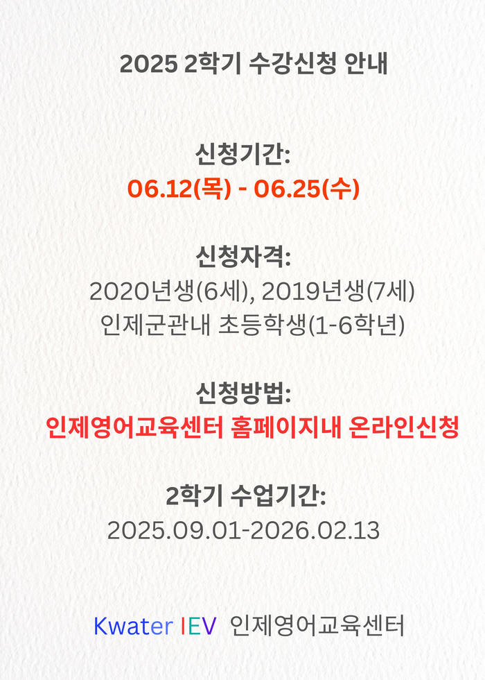 [스포츠서울ㅣ김기원기자]인제군은 이달 26일까지 인제영어교육센터 2025년 2학기 정규 프로그램 수강생을 모집한다.
