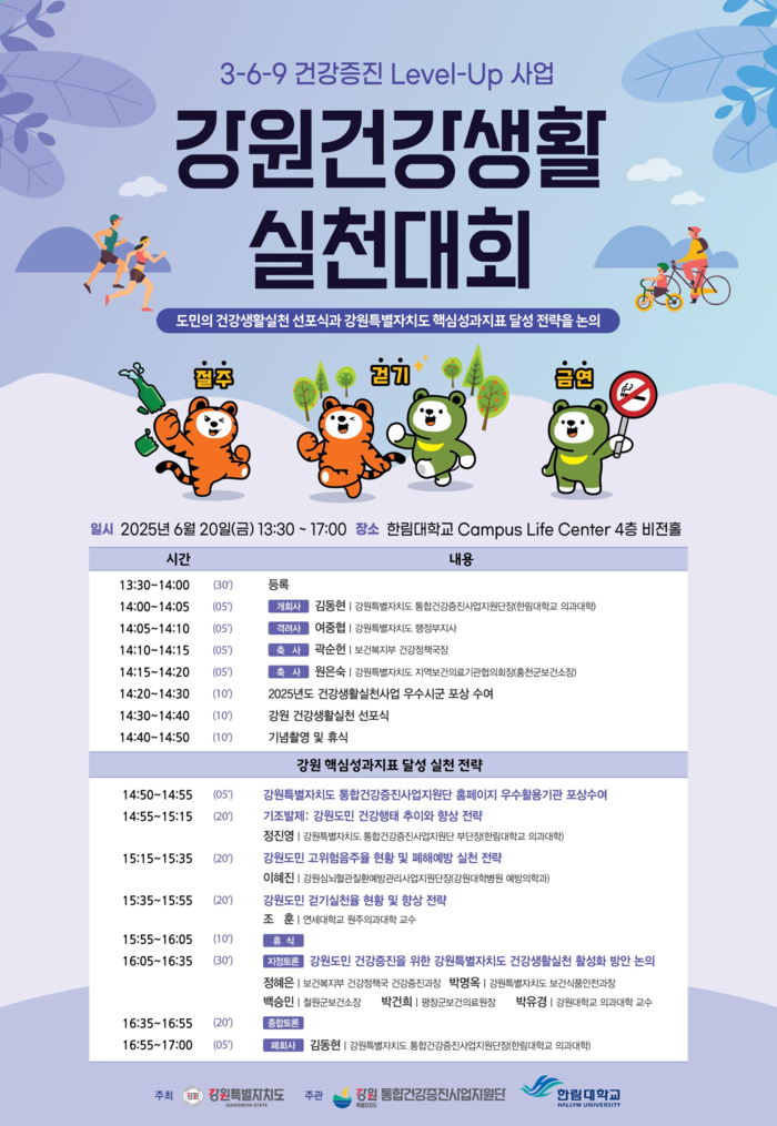 [스포츠서울ㅣ춘천=김기원기자]강원특별자치도(도지사 김진태)는 6월 20일(금), 춘천 한림대학교 캠퍼스라이프센터에서 『강원건강생활실천대회』를 개최하고, 건강한 강원 실현을 위한 금연, 절주, 걷기 실천문화 확산에 본격적으로 나섰다.