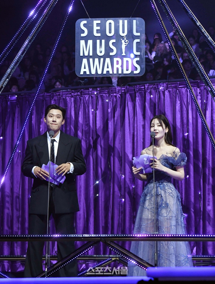 배우 김성철(왼쪽)과 남규리가 21일 오후 인천 중구 인스파이어 아레나에서 열린 제34회 ‘서울가요대상’에서 베스트 그룹상 수상자를 발표하고 있다. 2025. 6. 21.