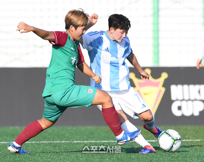 울산과학대 김수아(오른쪽)가 23일 경남 합천에서 열린 ‘2025 스포츠케이션 명품도시 합천에서 펼쳐지는 제33회 여왕기 전국여자축구대회’ 대학부 대전대덕대와 경기에서 대전대덕대 이은솔의 수비 속에 슛을 하고 있다. 2025. 6. 23.