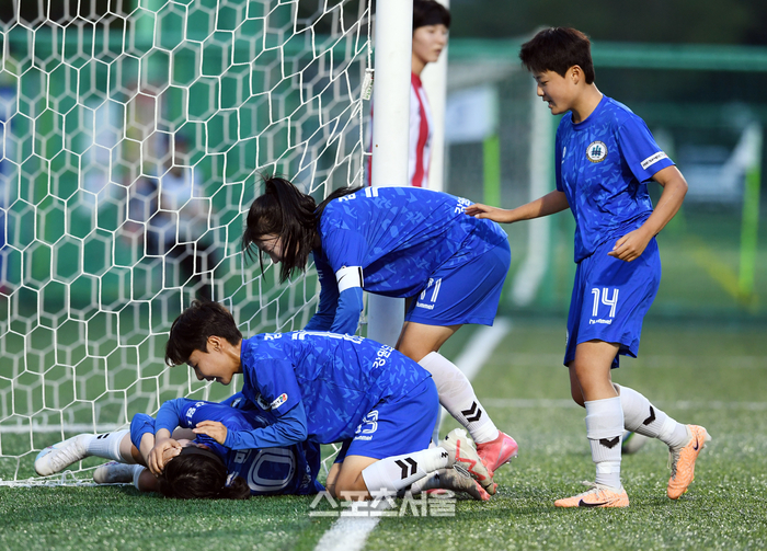 강원도립대 이수민(왼쪽)이 23일 경남 합천에서 열린 ‘2025 스포츠케이션 명품도시 합천에서 펼쳐지는 제33회 여왕기 전국여자축구대회’ 대학부 세종고려대와 경기에서 동점골을 넣으면서 세종고려대 골키퍼 위혜빈과 부딪히면서 고통스러워하고 있다. 2025. 6. 23.