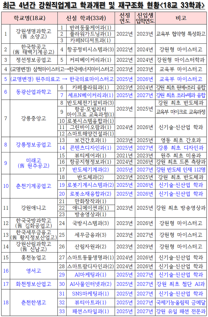 이번 개편은 급변하는 산업 현장의 수요와 학생·학부모의 진로·진학 선호도를 적극 반영하였다. 2018년부터 2021년까지 4년간 4개교 4학과 수준에 머물던 개편 실적이, 2022년부터 2025년까지 4년간 누적 18개교 33학과로 대폭 확대되며, 강원 직업교육 혁신의 새 전기를 마련했다.