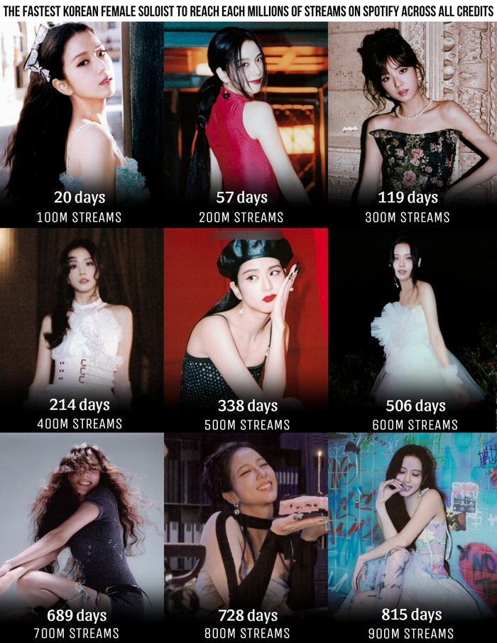 지수는 또한 스포티파이에서 8억 스트리밍(728일), 7억 스트리밍(689일), 6억 스트리밍(506일), 5억 스트리밍(338일), 4억 스트리밍(214일), 3억 스트리밍(119일), 2억 스트리밍(50일), 1억 스트리밍(20일)을 달성한 가장 빠른 한국 여성 가수가 됐다.