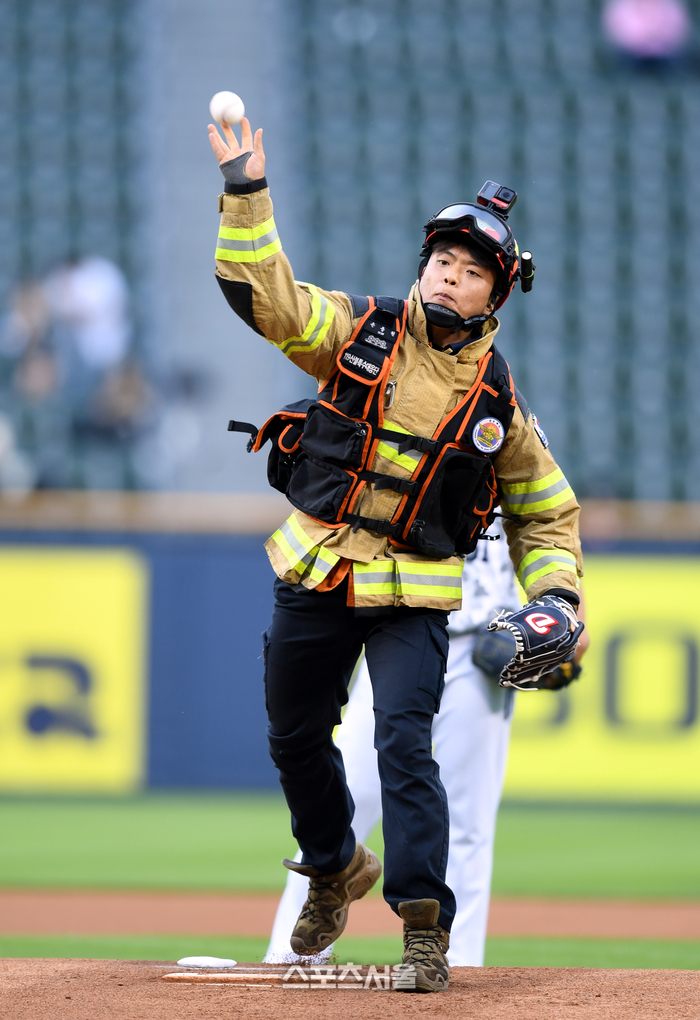 경북 119 산불대응단 손용원 소방교가 24일 서울 잠실구장에서 열린 2025 KBO리그 두산과 SSG의 경기 시구를 하고 있다.