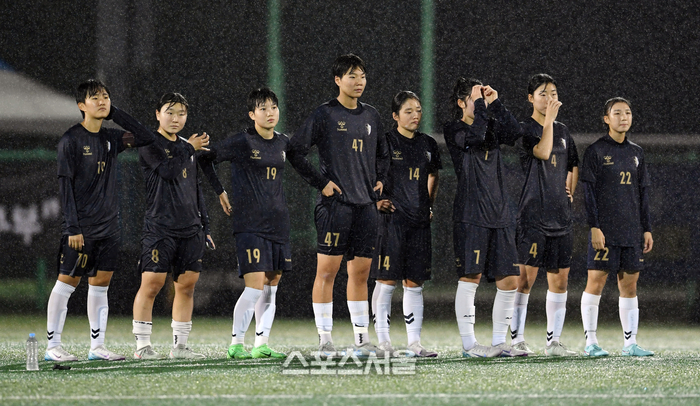 충북 예성여고 선수들이 24일 경남 합천에서 열린 ‘2025 스포츠케이션 명품도시 합천에서 펼쳐지는 제33회 여왕기 전국여자축구대회’ 고등부 경북 포항여전고와의 8강전에서 승부차기 끝에 패한 뒤 아쉬워하고 있다. 2025. 6. 23.