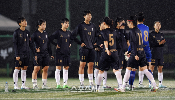 충북 예성여고 선수들이 24일 경남 합천에서 열린 ‘2025 스포츠케이션 명품도시 합천에서 펼쳐지는 제33회 여왕기 전국여자축구대회’ 고등부 경북 포항여전고와의 8강전에서 승부차기 끝에 패한 뒤 아쉬워하고 있다. 2025. 6. 23.
