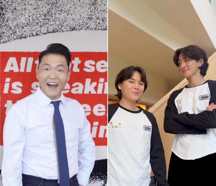 영상 속 싸이는 하늘색 스트라이프 셔츠에 파란 넥타이를 매고 환하게 웃고 있으며, 잔나비 멤버 최정훈과 김도형은 흑백 배색의 긴팔 티셔츠를 맞춰 입고 여유로운 표정을 짓고 있다.