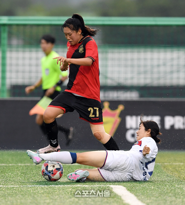 경기 오산정보고 이윤주(아래)가 24일 경남 합천에서 열린 ‘2025 스포츠케이션 명품도시 합천에서 펼쳐지는 제33회 여왕기 전국여자축구대회’ 고등부 경남로봇고와 8강전에서 경남로봇고 배서현의 공격을 태클로 막아내고 있다. 2025. 6. 23.