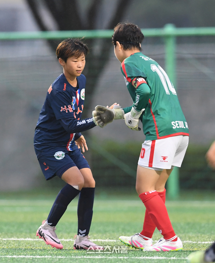 서울 우이초 오연서(왼쪽)가 24일 경남 합천에서 열린 ‘2025 스포츠케이션 명품도시 합천에서 펼쳐지는 제33회 여왕기 전국여자축구대회’ 초등부 충북 남산초와의 8강전에서 골을 넣은 뒤 골커피 김지예와 세리머니를 하고 있다. 2025. 6. 24.