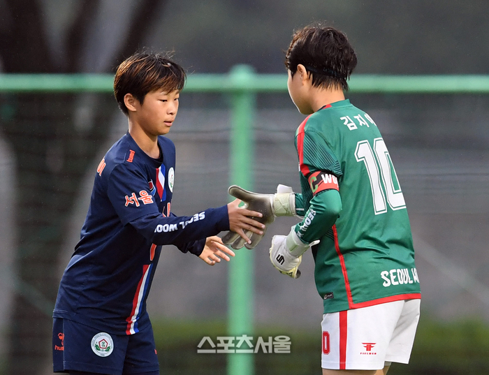 서울 우이초 오연서(왼쪽)가 24일 경남 합천에서 열린 ‘2025 스포츠케이션 명품도시 합천에서 펼쳐지는 제33회 여왕기 전국여자축구대회’ 초등부 충북 남산초와의 8강전에서 골을 넣은 뒤 골커피 김지예와 세리머니를 하고 있다. 2025. 6. 24.